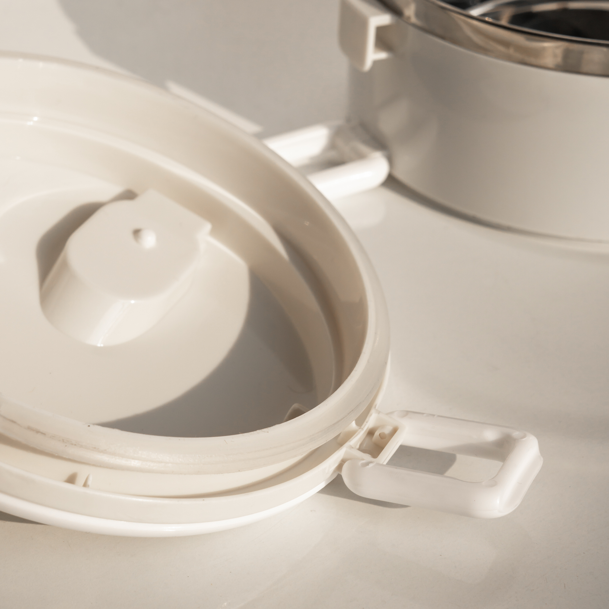 Hai khóa gài hai bên ôm chặt thân hộp, giúp nắp đóng kín, hạn chế rò rỉ canh, sốt khi di chuyển.