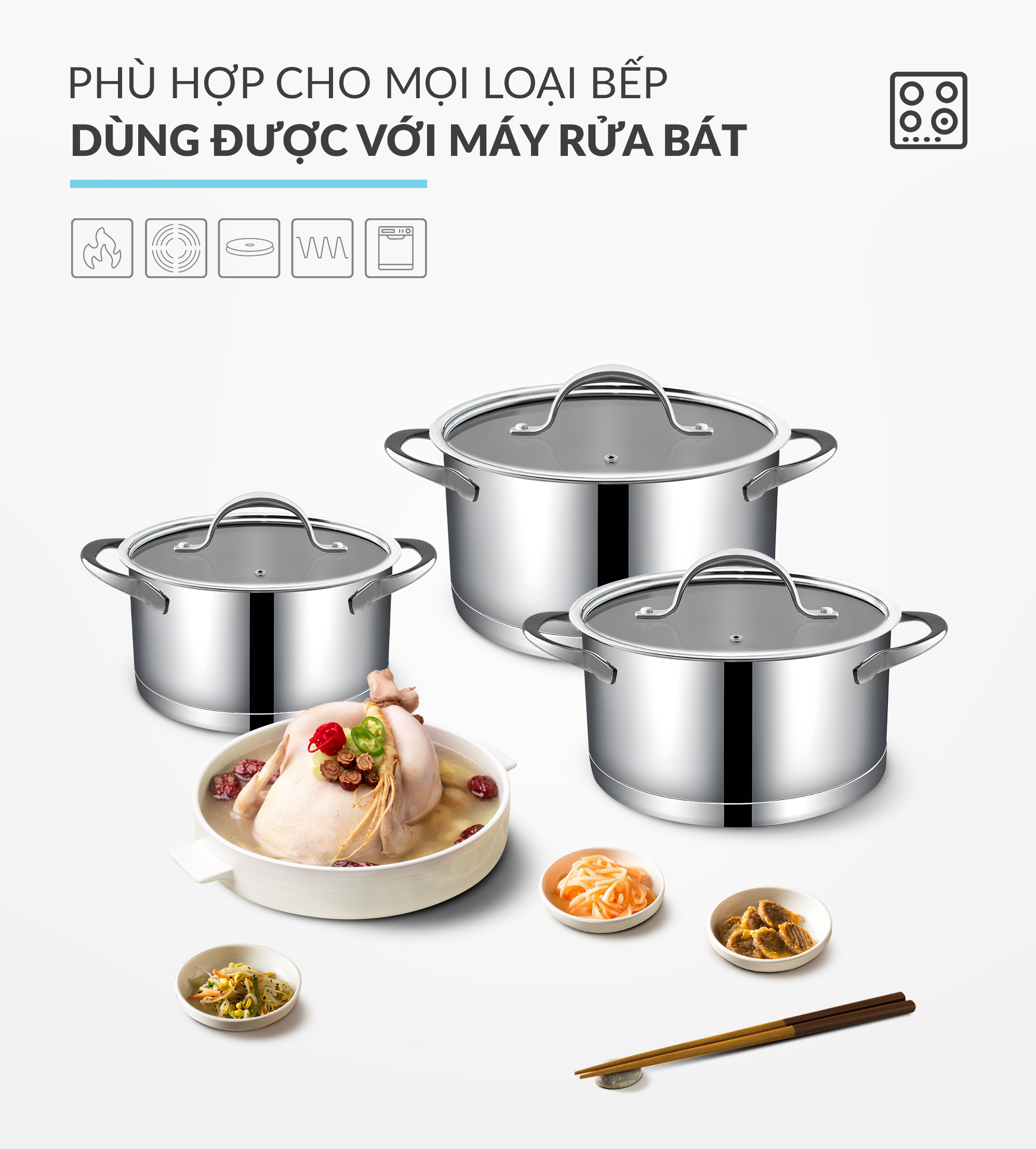 Sử dụng cho bếp từ, bếp điện, bếp gas, an toàn với máy rửa bát.